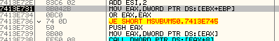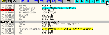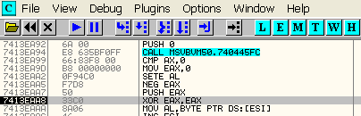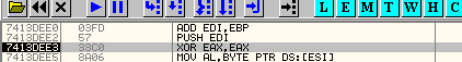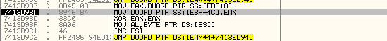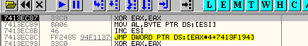 Видим, что далее в EAX помещается ноль, что означает завершение проводимых операций с данным опкодом и инициализацию регистров для чтения следующего. На следующей строке, действительно, читается следующий опкод.