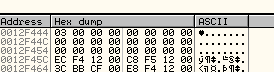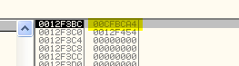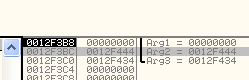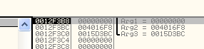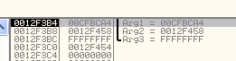 Первым является значение, которое было сохранено предыдущим опкодом, а два других значения в моём случае равны 12f458 (локальная переменная ebp-88) и -1 – третий параметр. Нажимаем F8, чтобы не заходить внутрь вызова.