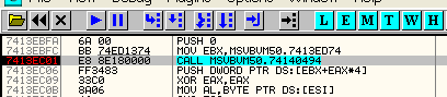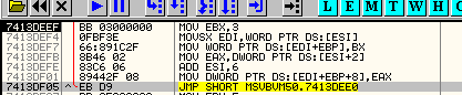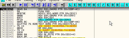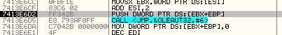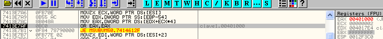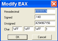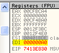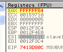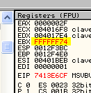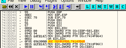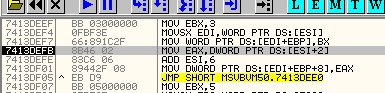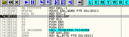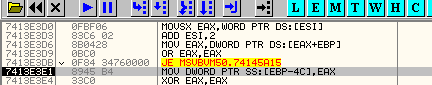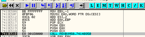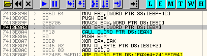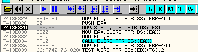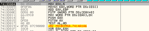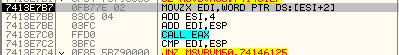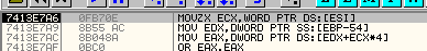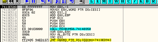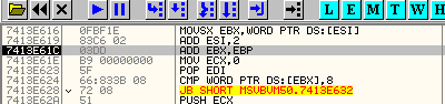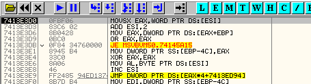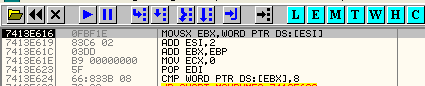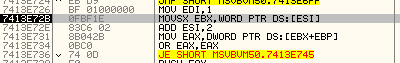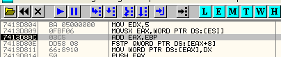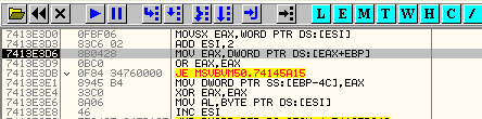Хорошо, они помещаются в EAX с помощью инструкции MOVSX, и значение FF74 является отрицательным (мы рассматривали это в главах, посвящённым ассемблеру). Продолжаем трассировать.