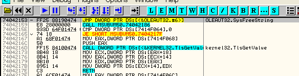 Здесь видим выполнение опкода 04 FLdRfVar, это несколько маленьких строк кода, ничего такого, чтобы испугаться, хе-хе, и в конце видим, что заканчивается XOR EAX, EAX – это подготовка к чтению следующего опкода.