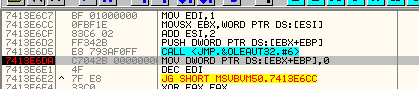 Здесь увеличиваем указатель ESI на два и складываем EBP с -88, и результат этой операции помещается в EAX.