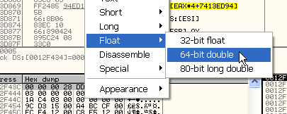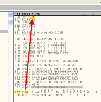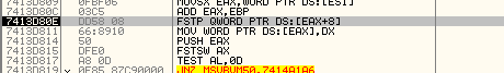 FSTP сохраняет первое первое значение из стека плавающей запятой, то есть из ST(0), в указанную ячейку памяти (в данном случае [EAX+8], то есть 12f43c) и делает следующий элемент стека верхним. Ок, мы рассмотрим это позже.