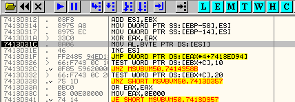 На который, как видим, указывает ESI. На следующей строке никаких действий по выполнению опкода не предпринимается. Значение ESI увеличивается на 1, чтобы затем прочитать параметры опкода.