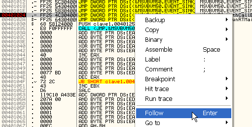 Ищем сверху от точки входа и быстро встречаем JMP на функцию MethCallEngine и, находясь прямо на этой строке, делаем правый клик мышью и выбираем FOLLOW, что приведёт нас прямо к данной функции, где и устанавливаем BP.