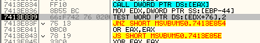 Далее в EAX помещается содержимое EBP-88, проверяется, равно ли оно нулю, так как оно не равно, то продолжаем дальше.