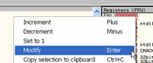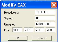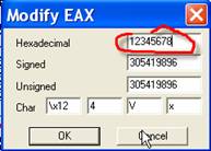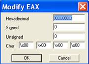 Как мы увидели, в OllyDbg можно изменять значения регистров. Всё, что мы сделали с регистром EAX применимо и к другим регистрам: отметьте регистр, значение которого вы хотите изменить, затем кликните по правой кнопке и нажмите “Modify”. Единственное исключение - это EIP, указывающий на инструкцию, которая должна выполнится.