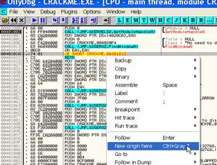 После того, как отметили, например, 40101A, кликаем правую кнопку мыши -> “New origin here”, и EIP изменится на 40101A, и таким образом, программа продолжит выполнение именно с этго места.
