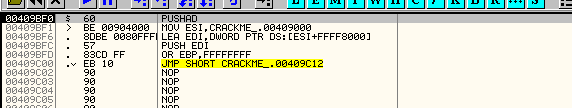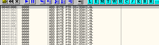Но если настоять и с помощью шестнадцатеричного редактора поместить 90 90 в 401000, открыть крэкми в OllyDbg, а затем посмотреть, что находится в 401000, то сначала будут идти 90 90, нули, а кода запустится распаковочная процедура и сохранит изначальные значения в первую секцию, наши изменения будут перезаписаны.