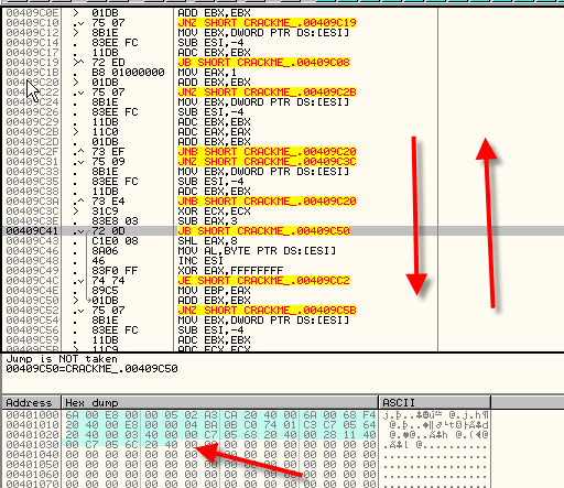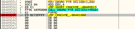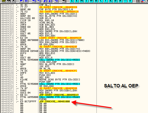Дойдя до сюда, видим как распаковщий в поте лица перемещает байты в цикле, заполняя между тем первую секцию изначальными значениями. После завершения этой процедуры, JMP совершает переход на OEP.