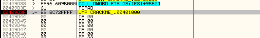 Вот OEP с тем же кодом, что и в оригинальном крэкми Cruehead'а. Распаковщик завершил свою работу, расшифровав весь изначальный код, после чего сделал переход на OEP, чтобы начать выполнение программы. Сперва, как мы видели, здесь были только нули.