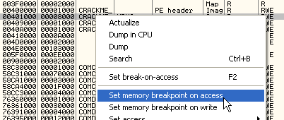 Ладно, устанавливаем BPM ON ACCESS на первой секции запакованного крэкми, чтобы посмотреть, произойдёт ли останов, когда начнётся распаковка. Делаем RUN.