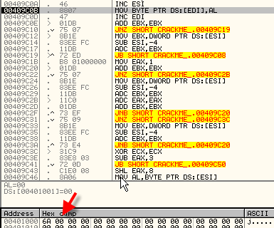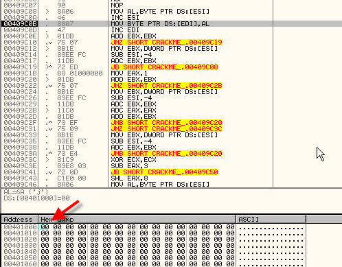 Точно, видим, что останавливается на моменте сохранения AL, равного 6A, в 401000. Смотрим, что находится в оригинальном файле по этому адресу.