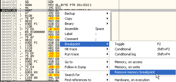 Очевидно, что если первая секция является пустой, как в данном случае, и в ней будет восстановлен изначальный код, то необходимо осуществлять запись в данную секцию, поэтому если используем BMP ON ACCESS на ней, то остановимся на процедуре, занимающейся расшифровкой кода.