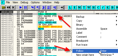 Здесь на второй строке видим CALL, о котором OllyDbg нам говорит, что это API-функция, хотя на самом деле это подготовительный шаг косвенного перехода, так что отмечаем эту строку и делаем FOLLOW.