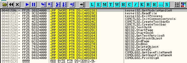 Здесь находим таблицу переходов, содержащую значения IAT, сюда мы попадаем при вызове каждой API-функции. Как видим, эти переходы начинаются с опкодов FF 25, поэтому во многих туториалах сразу делается поиск двоичной строки ‘FF 25’, чтобы попасть сюда гораздо быстрее.