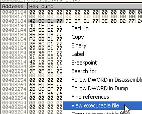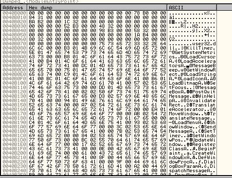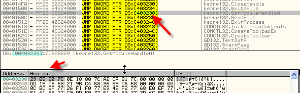 Довольно очевидно, что 403238 – это элемент IAT, где сохранён адрес API-функции GetModuleHandleA, и таким же образом можно посмотреть в DUMP’е часть IAT, что необходимо для определения где она начинается и где заканчивается.