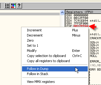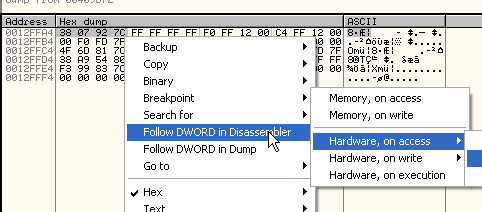 И в дампе смотрим сохранённые регистры, отмечаем первые 4 байта и устанавливаем HARDWARE BPX ON ACCESS.