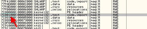 Конечно, на ваших машинах DLL-библиотеки могут находится по другим адресам, но здесь мы увидели, что на моей машине эти элементы соответствуют секции CODE kernel32.dll.