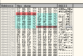 00403238 29 B5 80 7C 0E 18 80 7C )µ€|##€| 00403240 A2 CA 81 7C 00 00 00 00три API-функции, которые указывают на адреса 7Cxxxxxx, а затем идёт нулевой элемент, который отделяет следующую DLL.