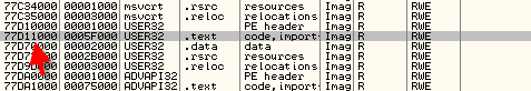 Адреса, находящиеся выше разделителя, соответствуют секции CODE библиотеки user32.dll. Продолжаем спускаться до следующего разделителя.