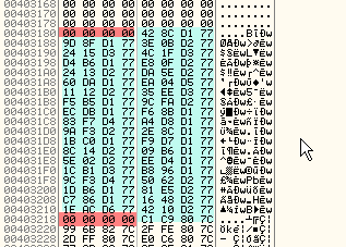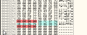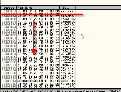 Ясно видим, что выше нет элементы, которые вели бы в какую-либо DLL, и в этом случае, вдобавок, ещё выше находятся все нули, которые нам облегчают нахождения начала IAT. Некоторые сложные упаковщики обычно заполняют мусором место перед IAT и после неё, что затрудняет обнаружение её начала, но как только мы знаем, что элементы IAT всегда должны вести в секцию кода библиотеки, то мы легко можем определить, что это мусор, так как он не ведёт в код никакой библиотеки.