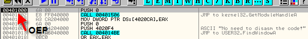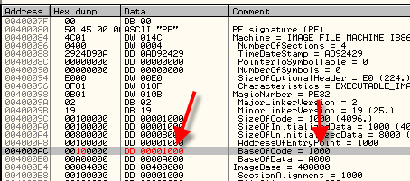 3) Третье – это OEP, также с вычтенной базой образа, то есть 401000-400000=1000