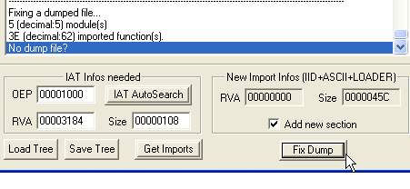 Видим, что элемент 3238 соответствует GetModuleHandleA. Так что сейчас починим дамп, идём к кнопку FIX DUMP.