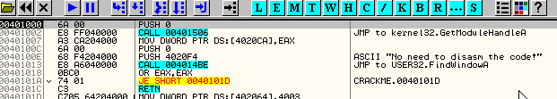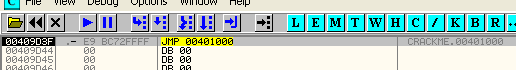 Теперь рестартуем крэкми в OllyDbg и увидим, что назойливое окошко исчезло, так как OllyDbg больше не считает ту секцию секцией кода.
