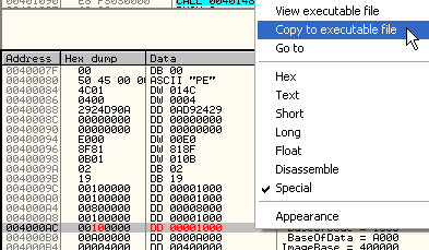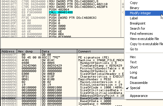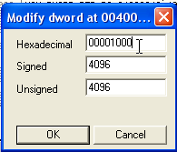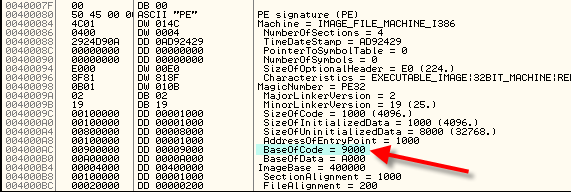 Здесь находится этот негодный указатель, означающий BASE OF CODE=9000, а мы хотим, чтобы первая секция была секцией кода, которая начинается в 401000, так что меняем 9000 на 1000.