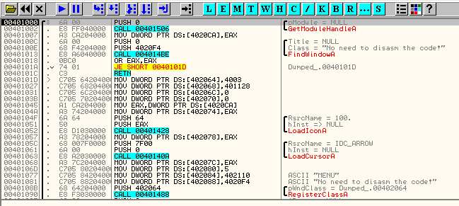 Ок, прибыли в то место, где программа распакована в памяти. Теперь сдампим её.