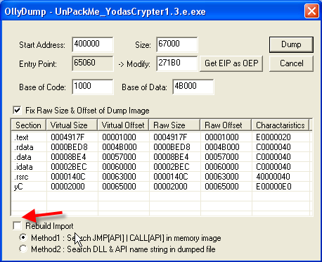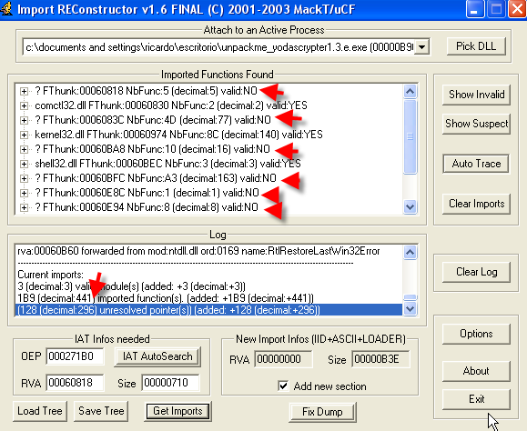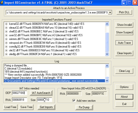 Видим, что IMP REC признал все значения правильными, и хотя остановленный процесс не служил в качестве источника для дампа, так как мы не дошли до OEP, это неважно, так как крэкми был сдамплен раньше, используя процесс, остановленный на OEP, и единственное, что в этом дампе неправильно – это IAT, которую мы можем починить, и всё будет будет работать. Нам нужно стереть предыдущий yodadump_.exe, который уже починен, и поискать дамп yodadump.exe и нажать “Fix Dump”, и он починится.