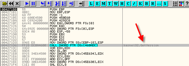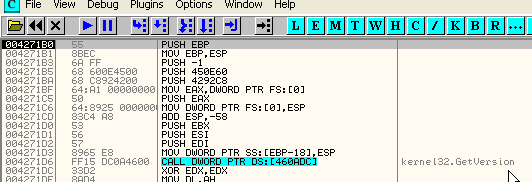 Ладно, начнём анализировать IAT, ищем вызов API-функции, это будет GetVersion, как обычно, хе-хе.