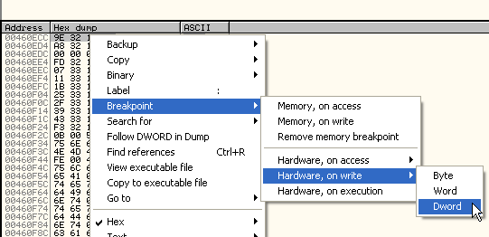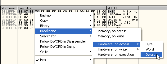 Делаем ESP-FOLLOW IN DUMP, а затем отмечаем первые 4 байта как в прошлые разы и устанавливаем HARDWARE BPX ON ACCESS.