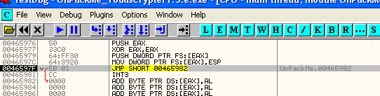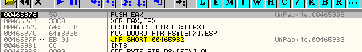 Те, кто хочет лучше исследовать этот вопрос, могут посмотреть, как обработчик исключений манипулирует контекстом для изменения EIP. Адрес исключения (т.е. где происходит исключение), обычно равный 465982, перезаписывается адрес OEP (т.е. 4271B0) для того, чтобы вернуться из исключения напрямую в OEP, хотя сейчас это не так важно. Выходим, отметив на будущее, что происходит со структурой CONTEXT.