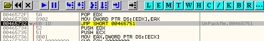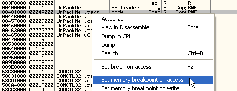 Тот, что в 46590B не сильно усложняет жизнь и приведёт в OEP, здесь мы можем установить BPM ON ACCESS на первую секцию и при проходе через исключение окажемся в OEP.