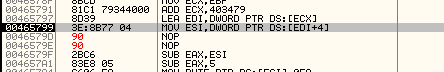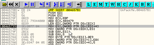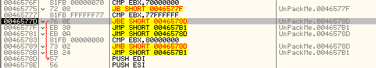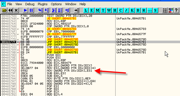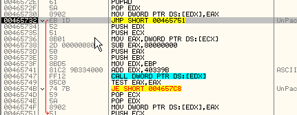Оттрасировав какой-нибудь плохой элемент, смотрим, является ли он волшебным, т.е. избегает ли вышеуказанного JMP, чтобы оказаться в области, где происходит сохранение плохого значения, и попробуем забить его NOP’ами, хотя сомневаюсь, что упаковщик не обнаружит забивки. Пробуем.