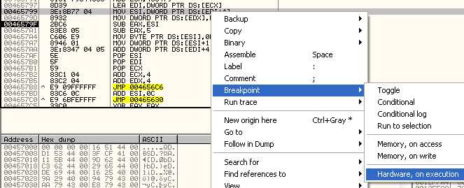Устанавливаем на него HARDWARE BPX ON WRITE до рестарта программы, так как HBP остаются даже после этого, и как мы уже видели при использовании метода PUSHAD, упаковщик не реагирует на этот вид остановов.