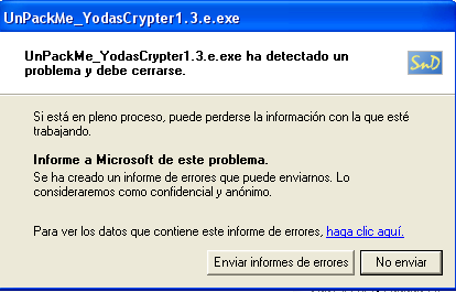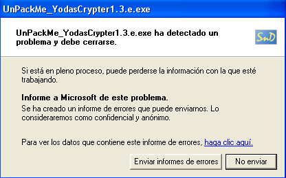 Конечно, если запустить yodadump.exe, то нам отобразится ошибка. Нам очень повезёт, если она запустится хотя бы на нашей машине, но мы уже видели, что в IAT’е есть переадресовочные элементы, которые точно не сработают при попытке получить доступ к этим несуществующим адресам через дамп.
