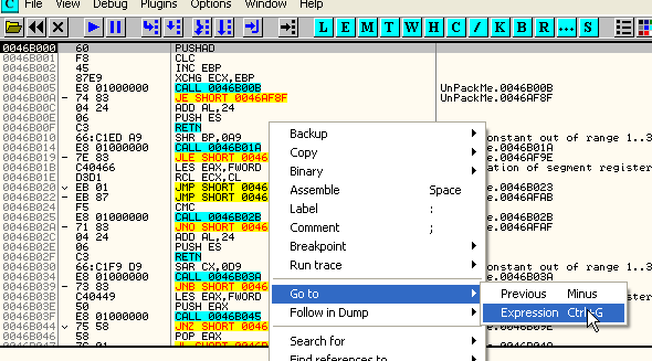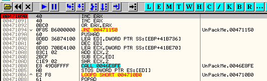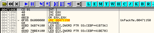00471090 40 INC EAXТеперь, раз уже прошли исключение, устанавливаем BP на OEP, так как распаковка уже произошла. BP послужит мне для того, чтобы остановится, когда завершим трассировку.