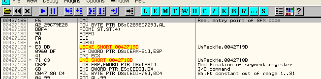 00485EAE Main JL SHORT 00485ECA 00485ECA Main POPAD ; EAX=00000000, ECX=0012FFB0, EDX=7C91EB94, EBX=7FFDF000, ESI=FFFFFFFF 00485ECB Main JMP SHORT 00485ECE 00485ECE Main JMP DWORD PTR DS:[485ED4] Breakpoint at UnPackMe.004271B5Это последние строки txt, и поищем отсюда наверх PUSH EBP, который обычно является первой инструкцией программы.