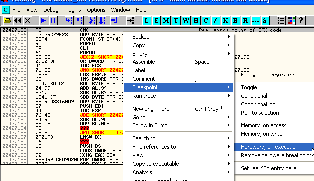 Отмечаем первую строку и устанавливаем HARDWARE BPX ON EXECUTION.