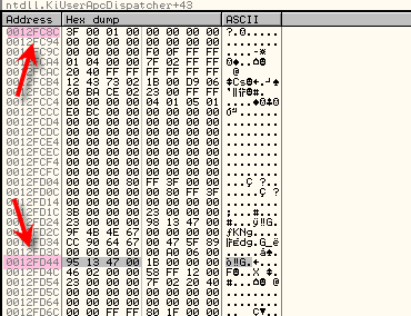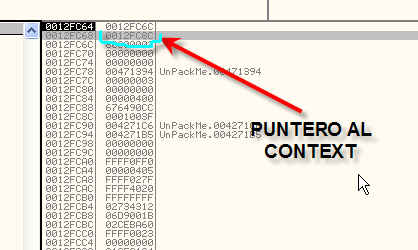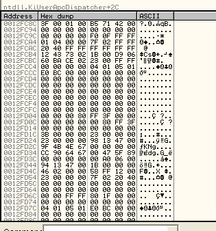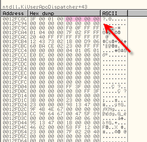 Когда останавливаемся на KiUserExceptionDispatcher, указатель на контекст находится во второй ячейке стека, смотрим контекст через дамп.