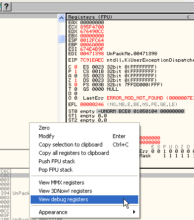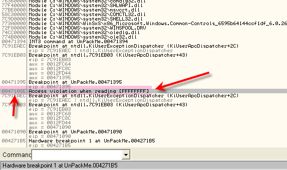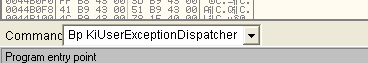 Запускаем снова распакуй-меня в OllyDbg и устанавливаем два BP. Столько же в KiUserExceptionDispatcher, сколько в CALL’е, которые ведёт нас к ZwContinue, как это показано на изображении.