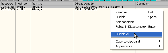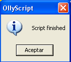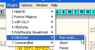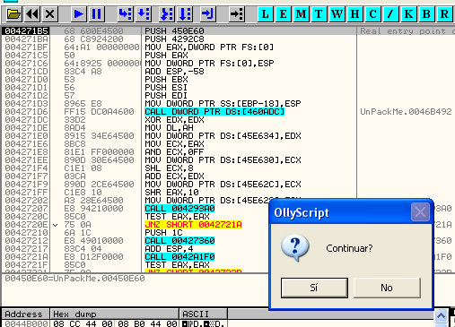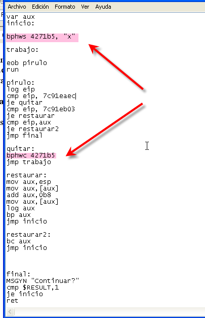 -------------------------------------------------------------------------------- <p> var aux inicio: bphws 4271b5, "x" trabajo: eob pirulo run pirulo: log eip cmp eip, 7c91eaec je quitar cmp eip, 7c91eb03 je restaurar cmp eip,aux je restaurar2 jmp final quitar: bphwc 4271b5 jmp trabajo restaurar: mov aux,esp mov aux,[aux] add aux,0b8 mov aux,[aux] log aux bp aux jmp inicio restaurar2: bc aux jmp inicio final: MSGYN "Continuar?" cmp $RESULT,1 je inicio ret --------------------------------------------------------------------------------В начале изменяемого нами скрипта находится