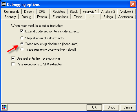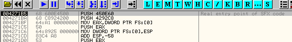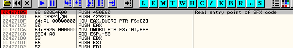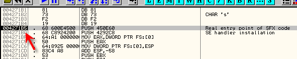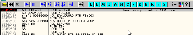 Из разных методов, которых так много используется для нахождения OEP в OllyDbg, используем встроенный поисковик OEP’ов, так что идём во вкладку SFX и устанавливаем галочку на «TRACE REAL ENTRY BLOCKWISE», нажимаем «OK» и перезапускаем OllyDbg, которая через некоторое время остановится здесь.