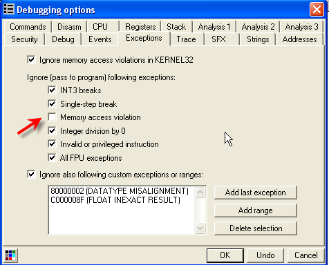 Лог показывает, что это последнее исключение до того, как прибудем в OEP, и как видим, это ACCESS VIOLATION WHEN READING. Снимаем галочку, чтобы остановиться на нём.
