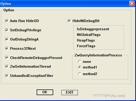 Ок, в моём parcheado4, который был приложен к предыдущей главе со всеми отмеченными исключениями и используя плагин HideOD 0.12 с конфигурацией, указанной на картинке ниже, нет никакой проблемы и всё прекрасно запускается. Вспомним, что этот упаковщик проверял с помощью API Process32Next, какие процессы открыты, и если обнаруживал, что он был открыт не с помощью двойного щелчка, то есть в отладчике или загрузчике, то не запускался, но плагин HideOD пытается защищаться от этого трюка и аннулирует антиотладку без каких-либо хлопот с нашей стороны.