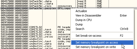 Здесь останавливаемся на последнем исключении, устанавливаем BPM ON ACCESS на секции исполняемого кода, и останавливаемся в обработчике исключений.