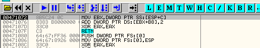 mov aux,[aux]Перемещаем в aux то, что там должно быть, теперь там, наконец-то, адрес последнего возврата, на следующей строке BP aux, устанавливаем BP на адресе возврата из исключения, а затем снова запускаем программу, и наконец: