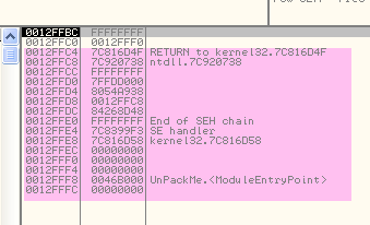 Видим, что когда произошла остановка на OEP, стек содержит на два значения больше, чем при запуске, и за исключением редких случаев – это признака украденных байтов, так что готовимся к их поиску.